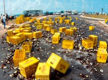 Um caminhão carregado com garrafas de cerveja tombou nesta segunda-feira (10) na Avenida Octávio Mangabeira, no bairro da Boca do Rio, em Salvador, e espalhou todo o conteúdo na pista. De acordo com a Superintendência de Trânsito e Transporte da capital baiana (Transalvador), o trecho, sentido aeroporto, teve que ser interditado, o que causou um grande congestionamento durante toda a manhã na região. Policiais Militares tiveram ainda que conter a ação de populares que tentaram saquear a carga. Todo o material já foi removido e o trânsito já flui normalmente. Desde o início da manhã, a Transalvador já registrou quatro acidentes com três feridos e um morto.(BN)